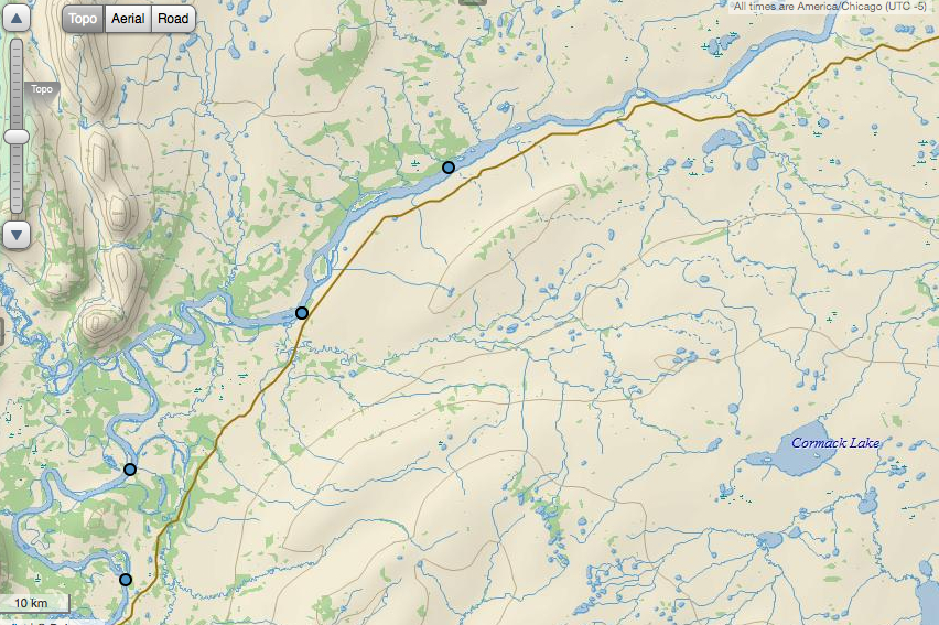 km 326. 180m (above river level), N 61˚6 W 122˚52. noon-9pm.