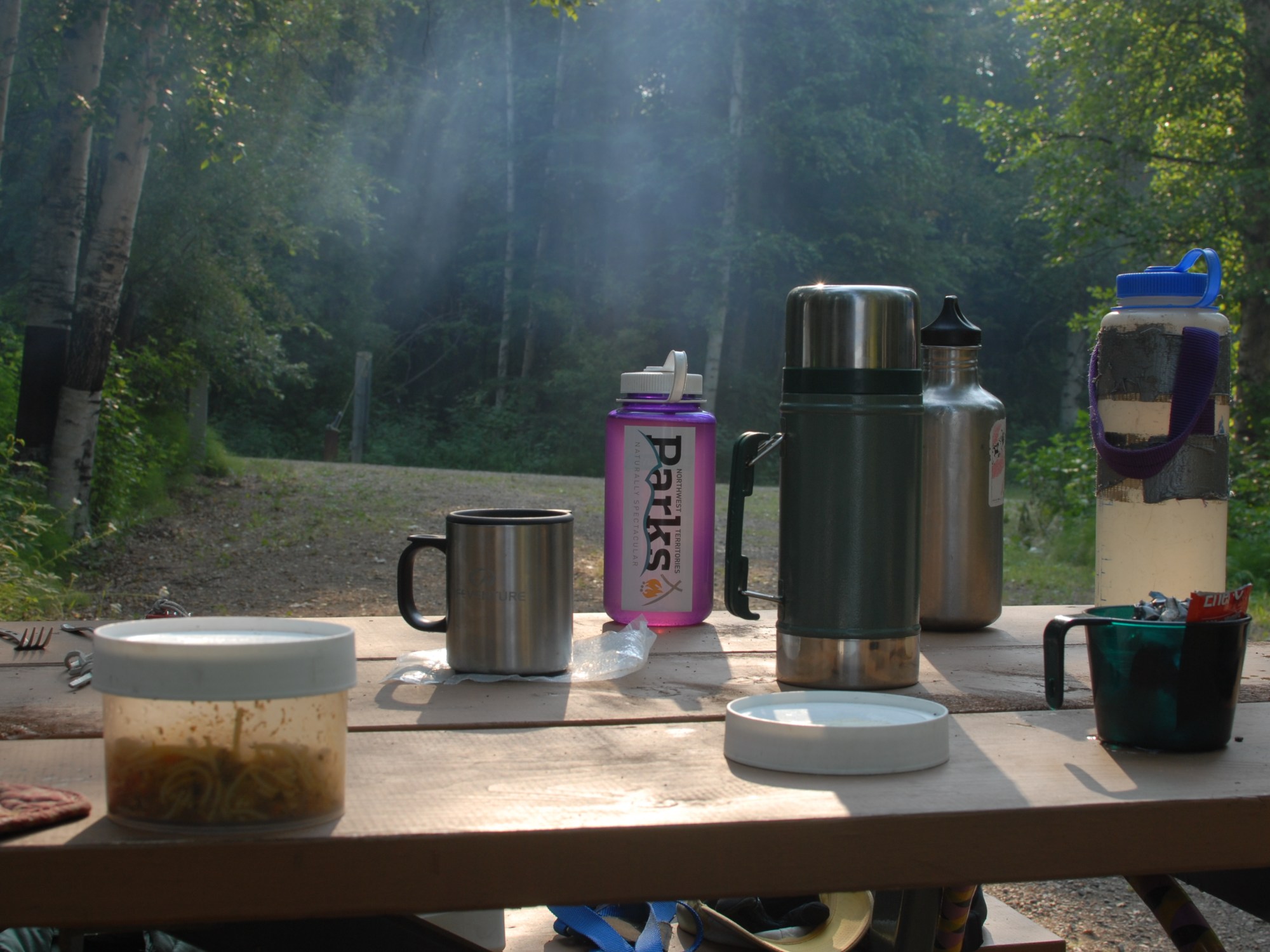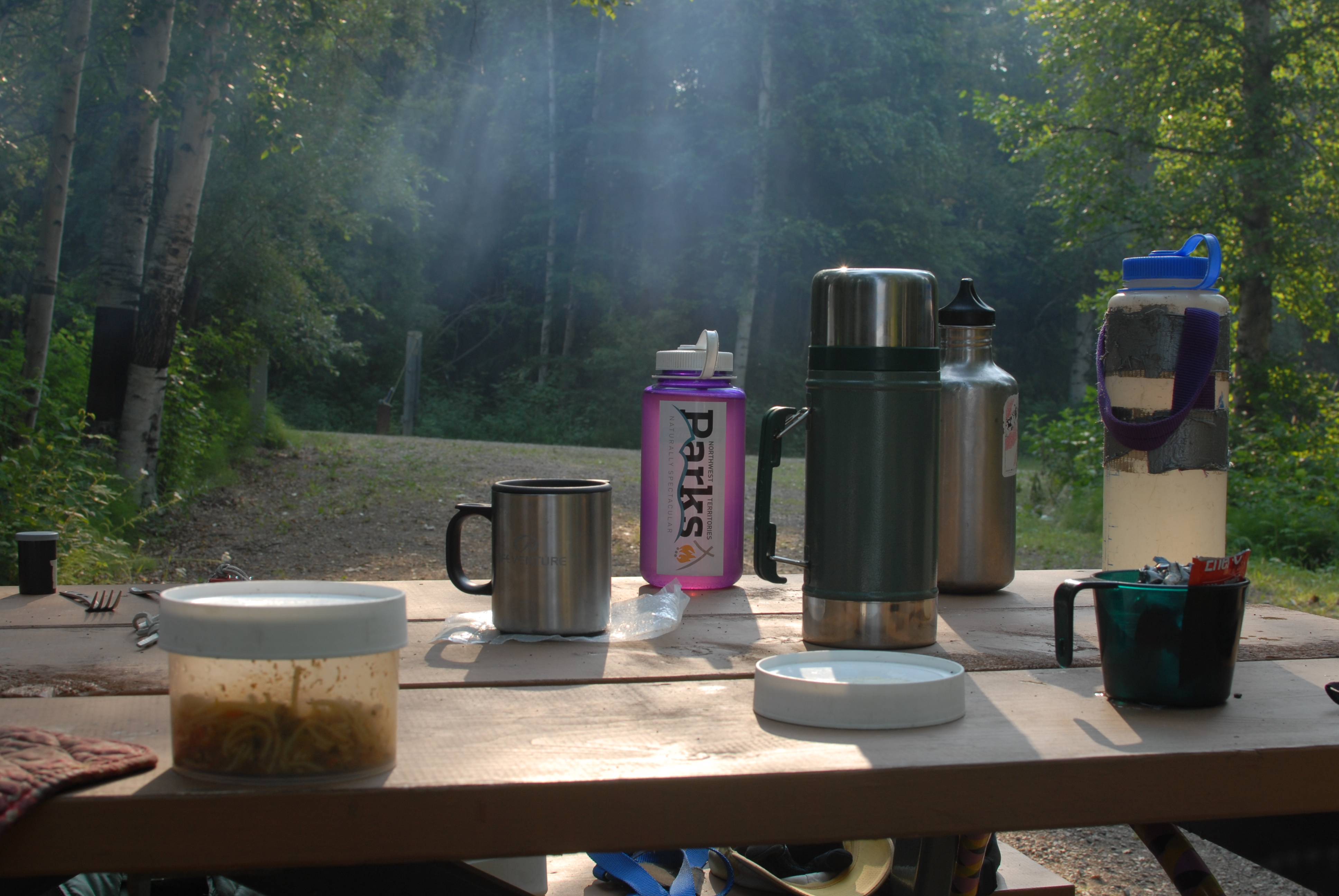witnessed nahanni butte and passed by the entrance of the south nahanni river into the liard. a river full of myth and wonder, so docile at its mouth. tiny tiny rain tonight, first of the trip other than a sprinkle on day 2. found some iron-rich streams flowing out of a cut-bank, so frigid it was too painful to stand in them.