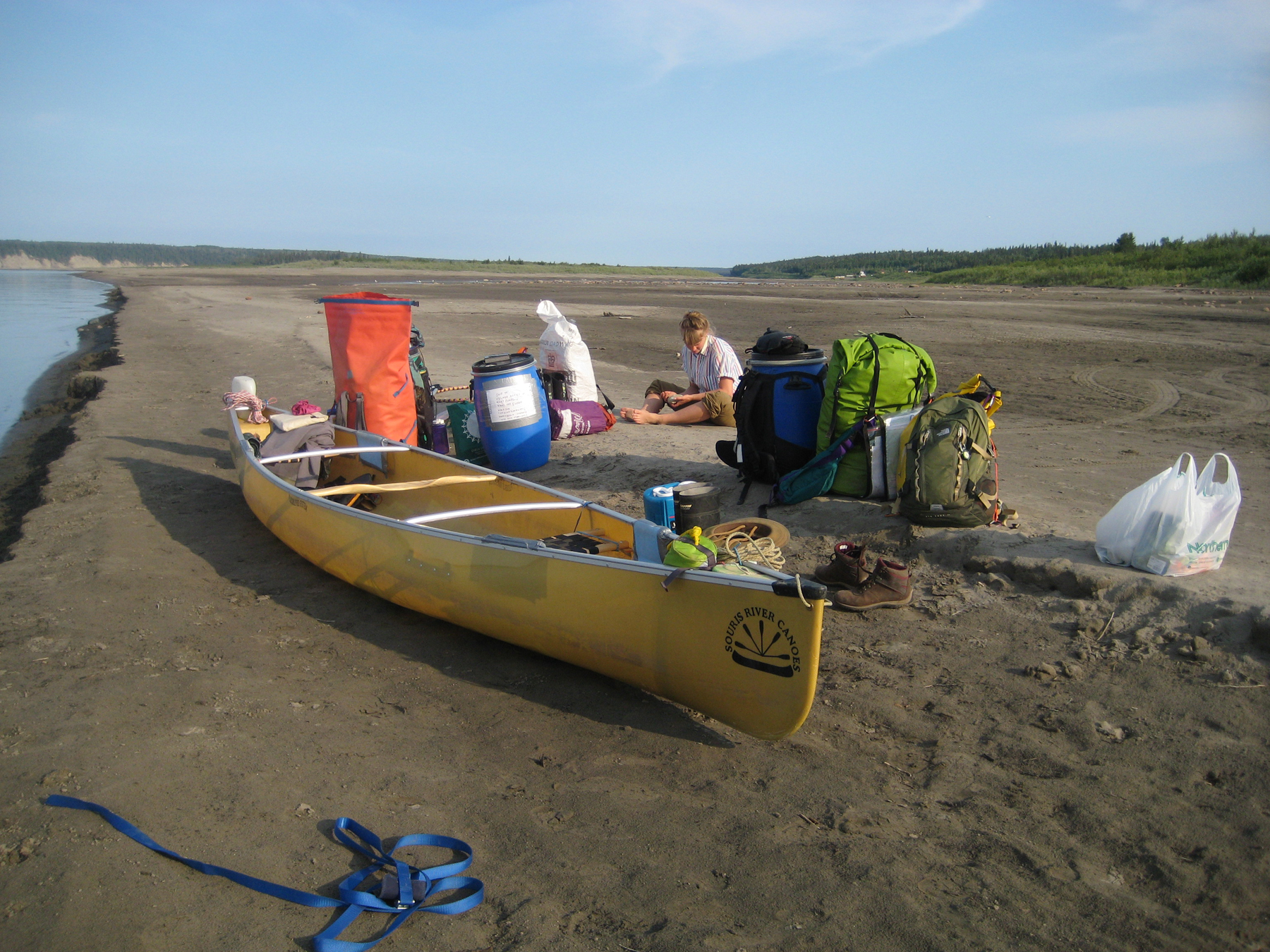 after spotting our first two black bears of the trip, we arrived in fort simpson at midnight and met the mackenzie/deh cho under the midnight sun. the next day we spent time at what we considered our second homes on the trip – visitor info centres (wifi and bathrooms with running water!). we were to start the trip with 3 barrels full of food but decided last minute to ship two ahead past the rapids. the folks at the info centre were swell – letting us ship them there and holding them for 2 weeks – and charlie hope of hopes ventures was our faithful barrel transport service. to save our backs, sylvia at the visitor centre called a taxi for us – a bit of an ordeal since she’d never had to call one before because the town is so tiny! it worked out in the end and 15$ got us a pick-up truck taxi with a newfoundland ex-pat. he regaled us with stories of his life as he drove us from the info centre to the campground to pick up the gear we’d left there during the day, then to the willows where we’d stashed the canoe and some gear, and then on to the edge of the sand bar.