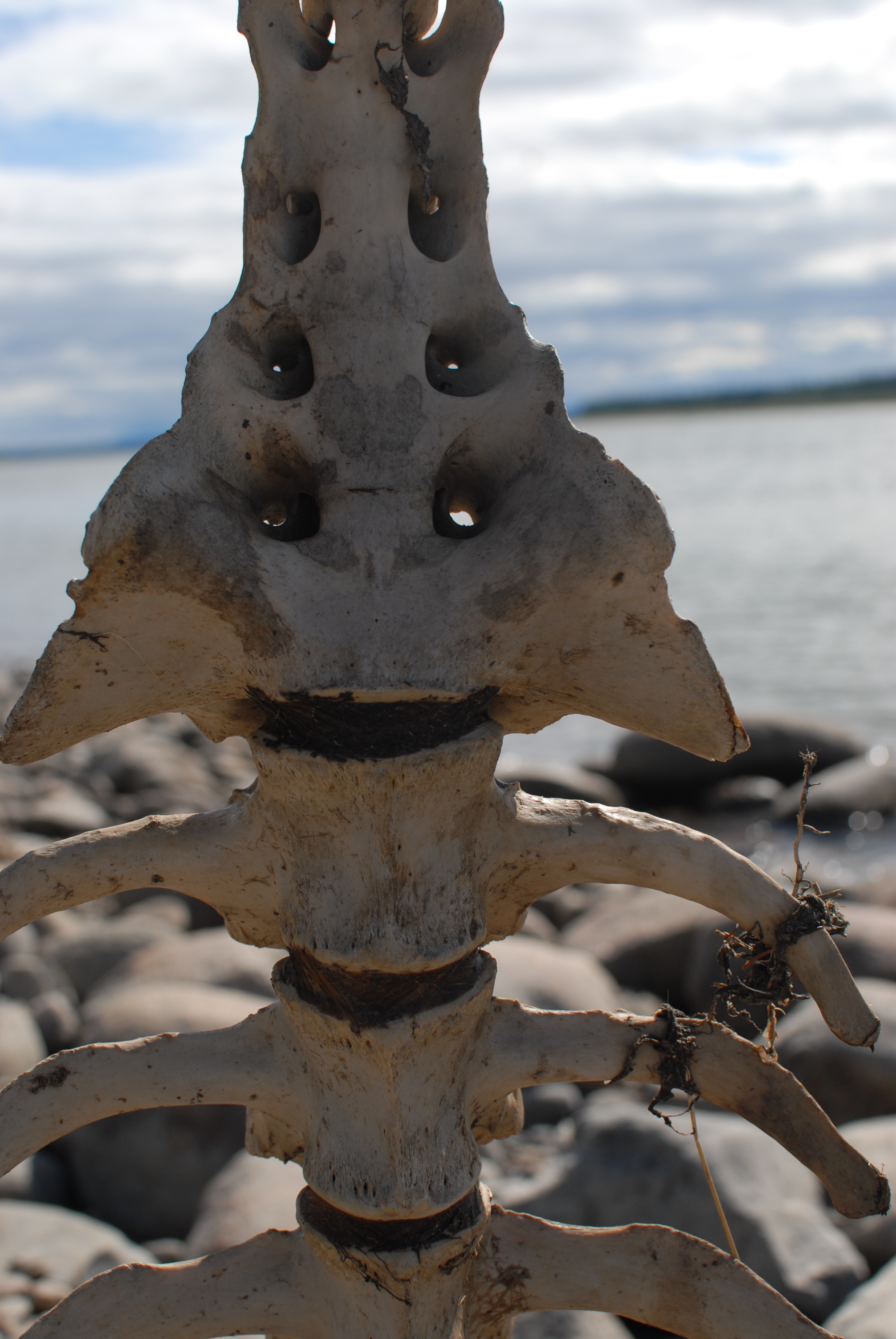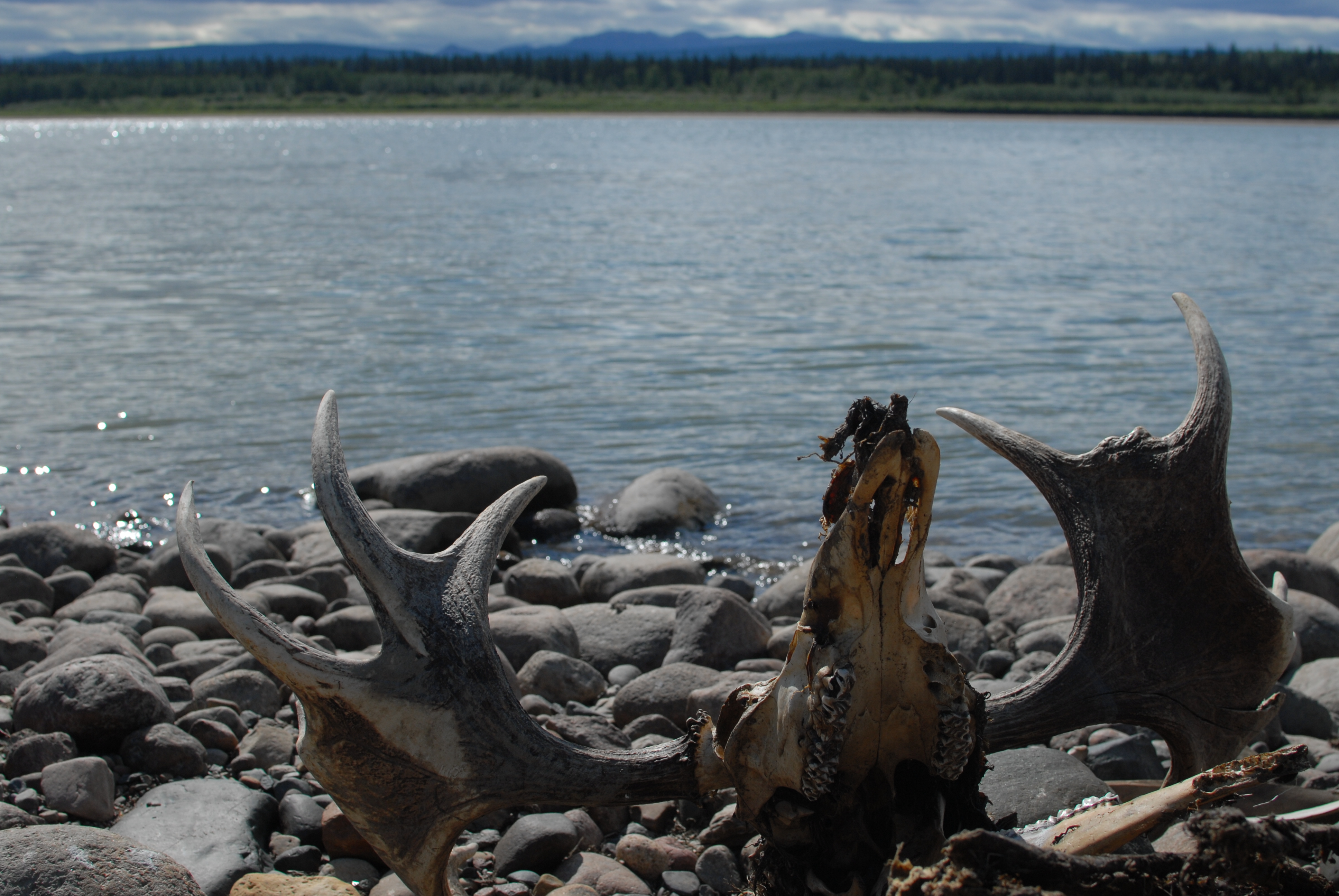 an hour or so into paddling emma spotted a huge moose skeleton on shore and we went to check it out. amazing. it wasn’t completely done decomposing so it was quite smelly.