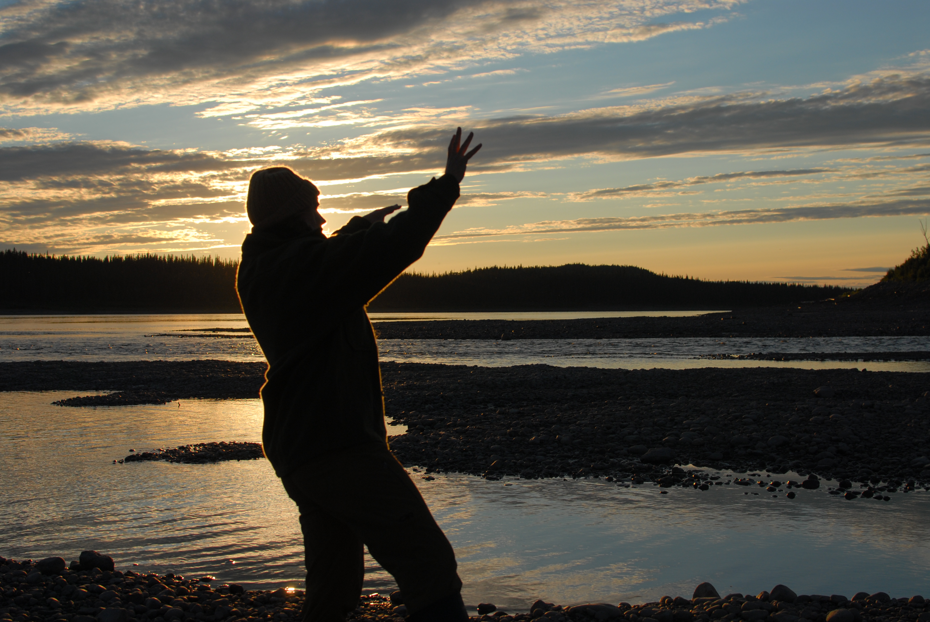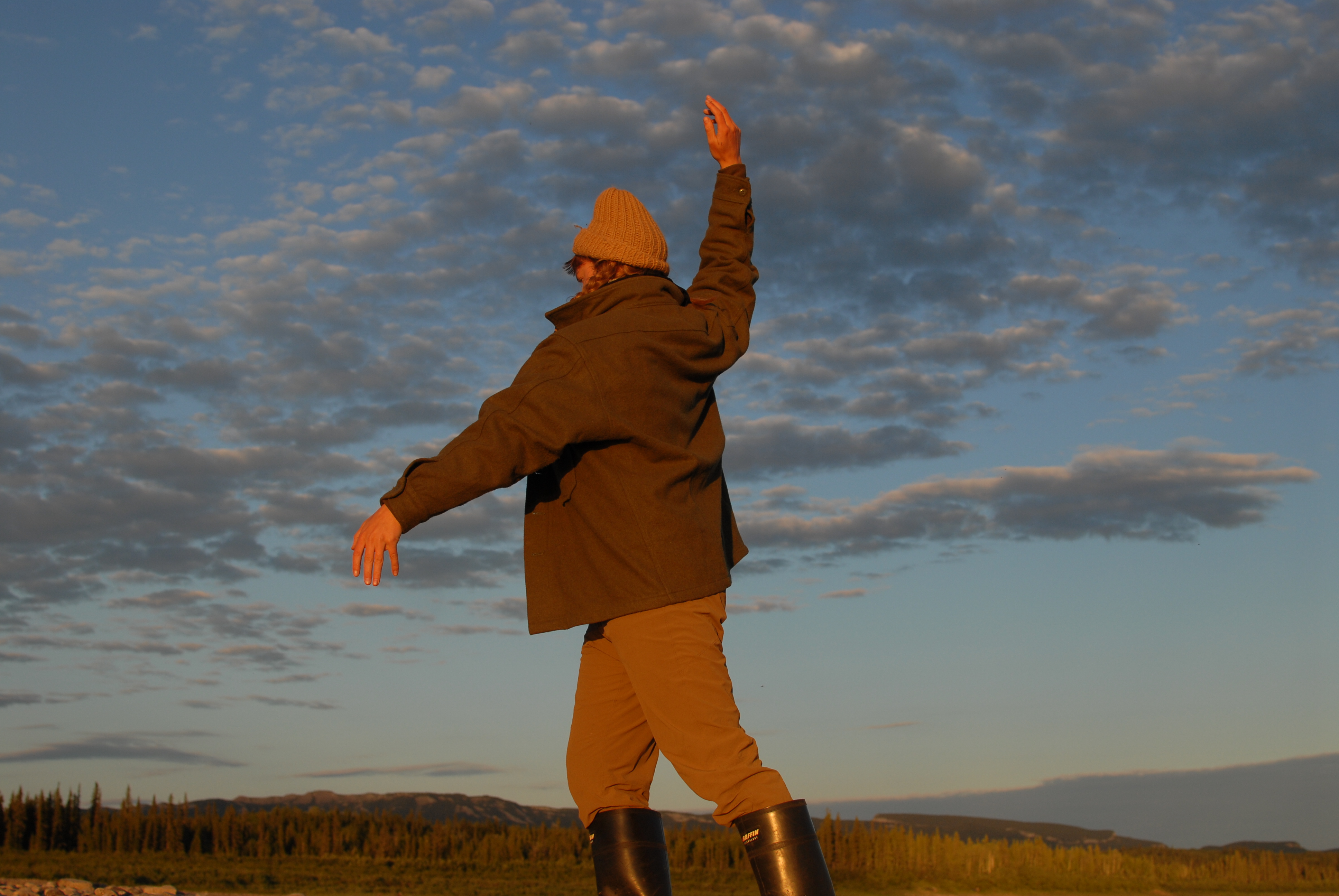 we passed the ‘river between two mountains’ tonight (what a great name for a river), where we did some dancing and filming. those photos were taken at 11:15 pm – gorgeous light. eventually we landed at old fort island, and oh my goodness beauty. sweeping vistas, spectacular rock (devonian limestone?), clear pools, the deh cho rushing around on either side of the island, clear springs. i can see why one of the original town-sites of Wrigley was here. photos to follow in the next post.