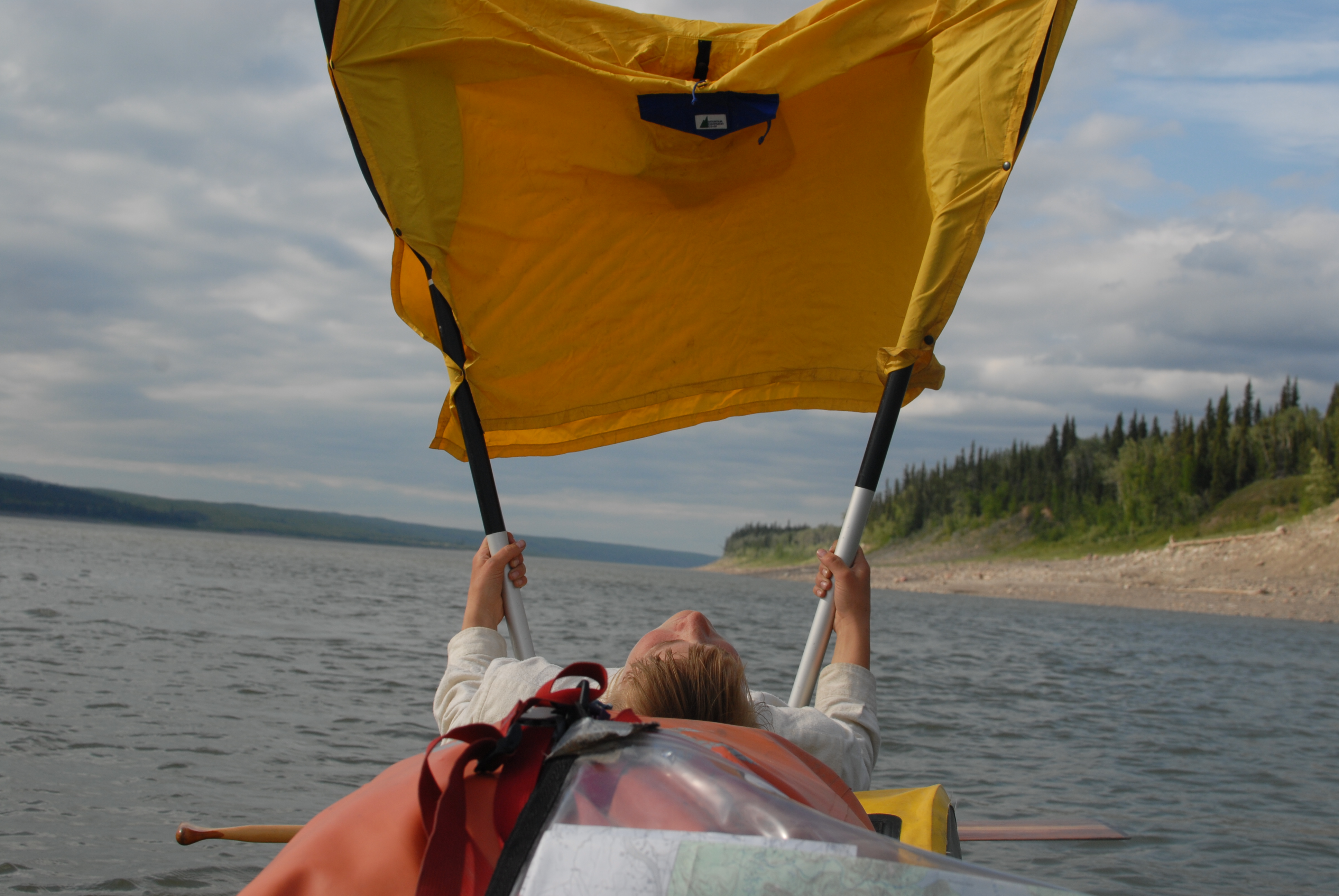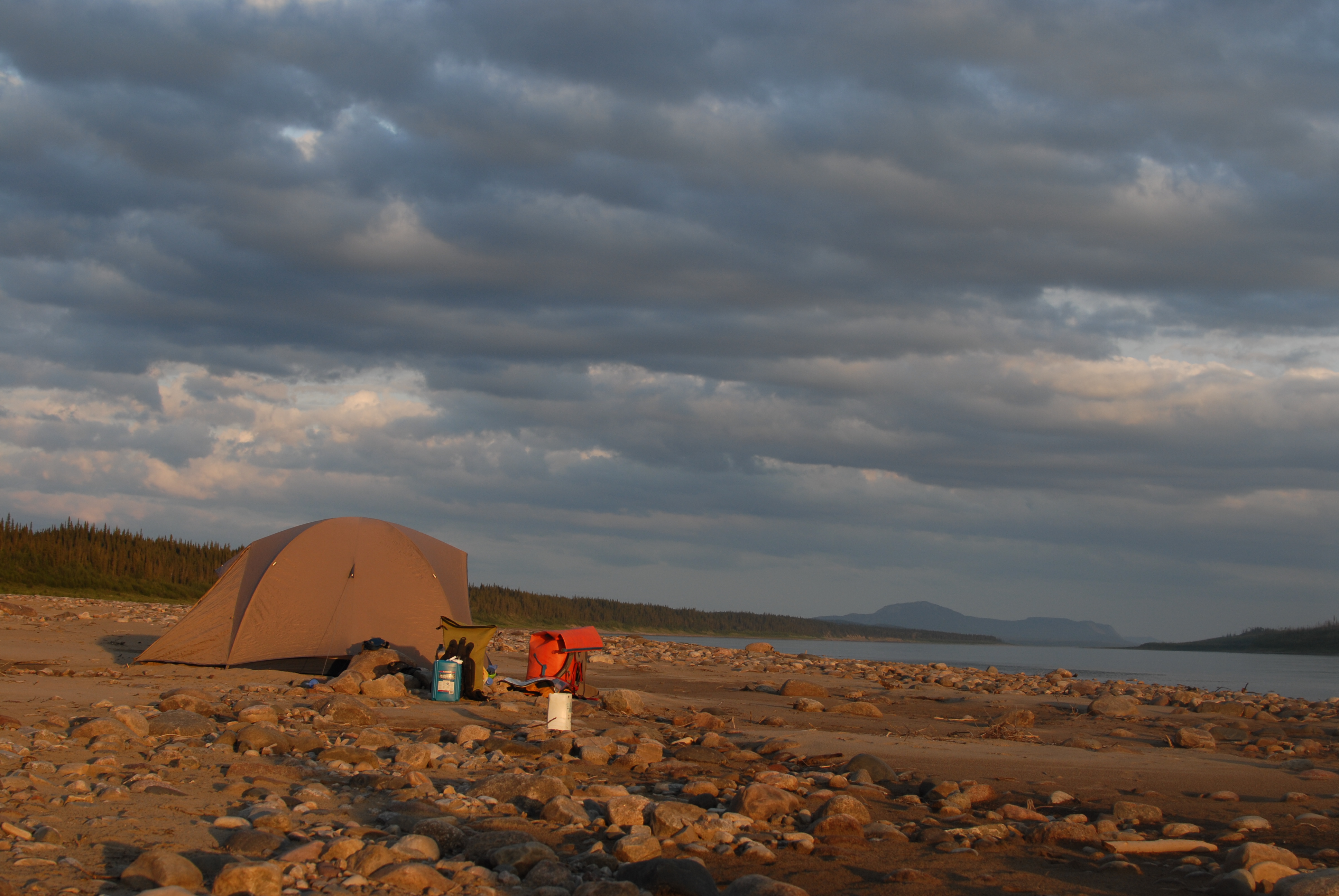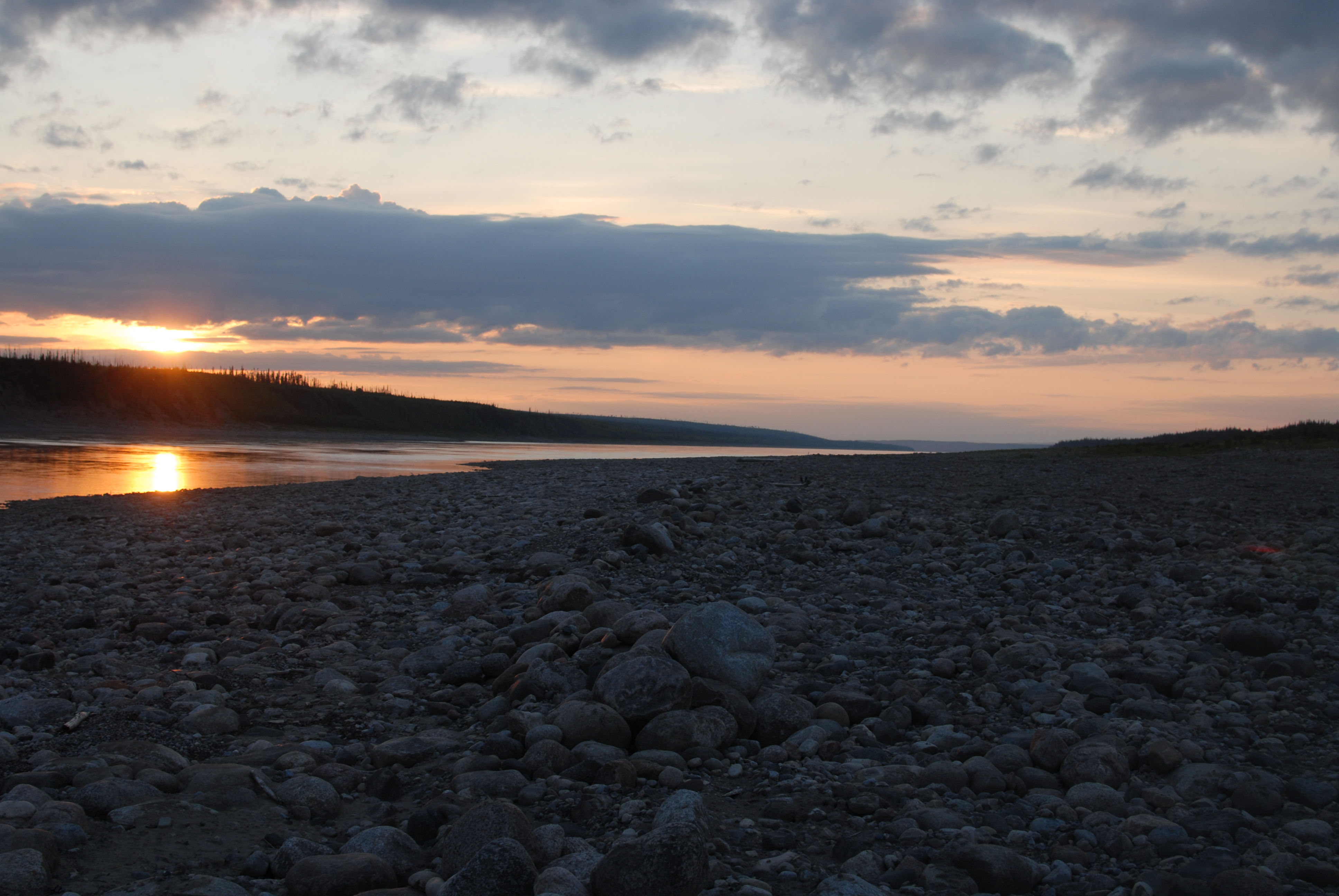 well, today we met the first friends who became for the next several weeks our river neighbourhood. the first folks we met were the Y camp trip – Sac Dene, out of Camp Chief Hector near calgary. we love them! navi, joe, ben, ian, jenna, nat, robin, seth, sydney and tara. wow, what a talented, caring, sweet, playful, fun bunch of people. they really helped make our trip how amazing it was. it was also neat that both emma and i have/had friends who are involved with the Y out of winnipeg, most of whom have been on canoe trips such as this at some point in their involvement with the Y, so we felt like we got to be a part of that a little. when we arrived in wrigley we tied up to what we thought was the community dock (after almost by-passing the town completely b/c it was so nondescript and happened much sooner than we expected), but later found out was the raft that fellow paddlers from winnipeg were building! their names are mike and aubrey (a CBC article on them can be found here) but we didn’t end up meeting them that day b/c they had hitched a ride back to fort simpson to stock up on food before continuing north. wrigley was peaceful and quiet, a local woman invited us into her house when she saw we were trying to get water at the closed band office, and then directed us to a woman named florence’s house when we told her we were in search of crafts. florence didn’t have anything at the time, but later as we were walking back down to the water she and her husband found us by truck, and she took our foot measurements to make moccasins for us. she was so kind and sweet, but it is something both emma and i have yet to follow up on. as we were readying the canoe to leave, we met nick and taylor of minnesota, who we would see a couple more times until the end in inuvik. they were paddling the river faster than we were and heading all the way to tuktoyuktuk.