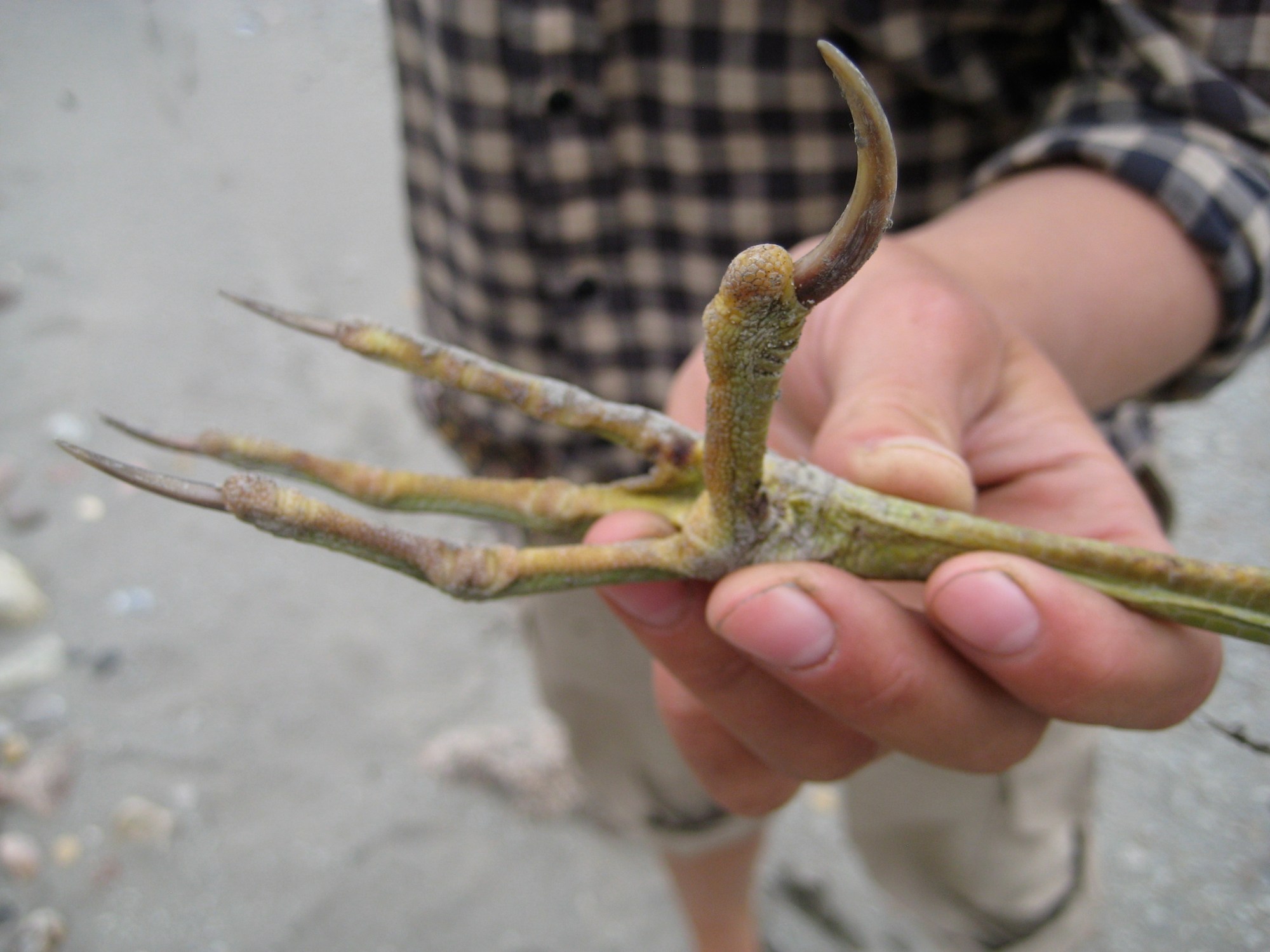 after pushing off from shore i realized my moss green sandals weren’t on my feet, so we had to paddle back (against the current) to get them. i tied bits of neon orange cord to them after that, and plan for all my outdoor gear from now on to be brightly coloured. after our 2nd take-off we saw a red canoe approaching and met will, a solo-er with kayak paddle from oklahoma. we split ways with him shortly but met up again later when he went to shore to make coffee. nick and taylor soon followed and we spent an hour or so talking and checking out the wild bits of bird that were strewn about the place, including the foot in the photo, a wing, a beak and lots of feathers. still undetermined what sort of bird it was. we got back on the river with a spectacular tailwind that escalated into too wild to paddle as we were rounding a slight bend near johnson river. nick, taylor and will had all pulled off, so we pulled off too, but hoped to keep going if the wind died – it seemed to be blowing rain in. as we were there considering the possibilities, the Y floated by with all their canoes rafted together and a sail up – not too rough for them. we were able to continue on maybe an hour or so later into what became flat-calm waters. nice. we caught up to the Y and camped with them at the blackwater river, spending the evening with them in their awesome canoe/tarp shelter, a welcome break from the rain.