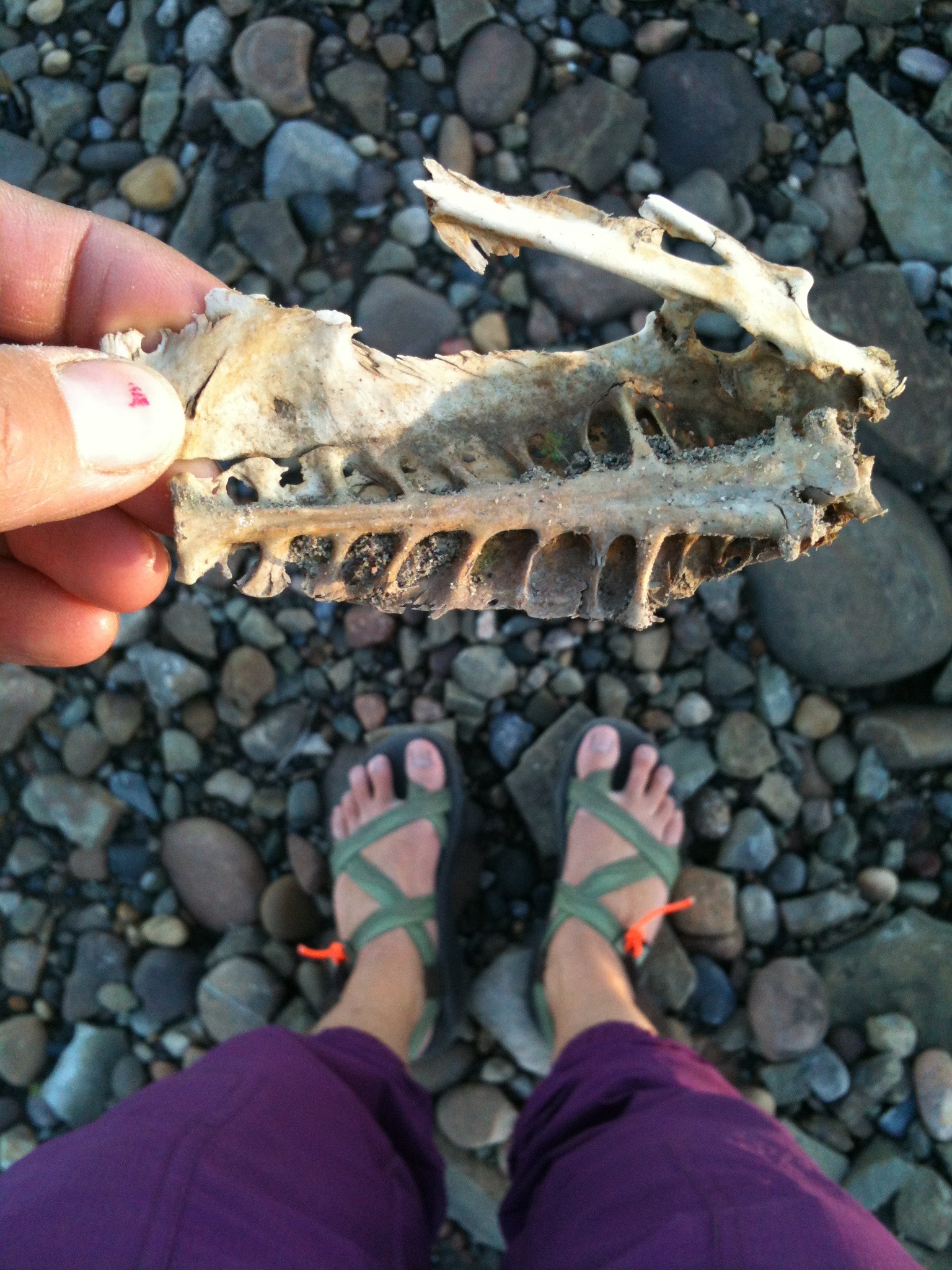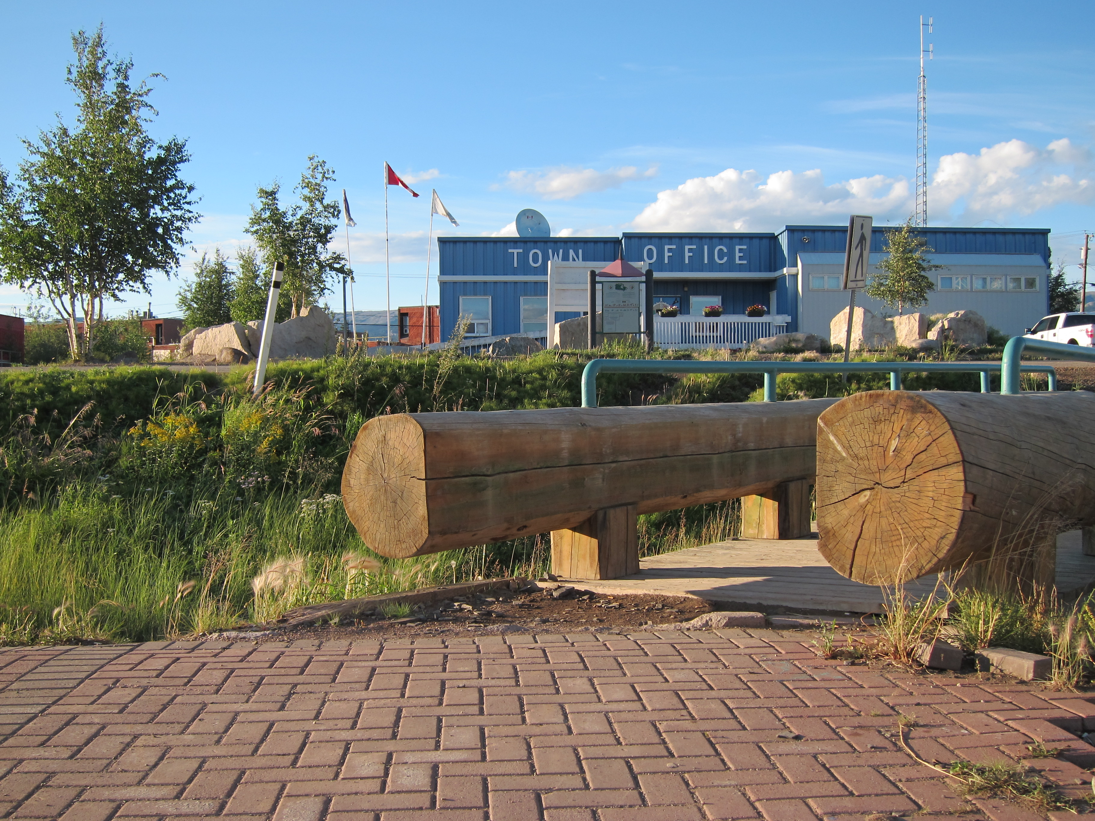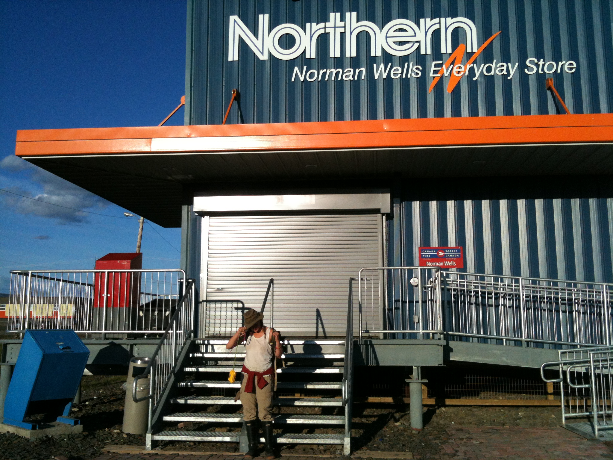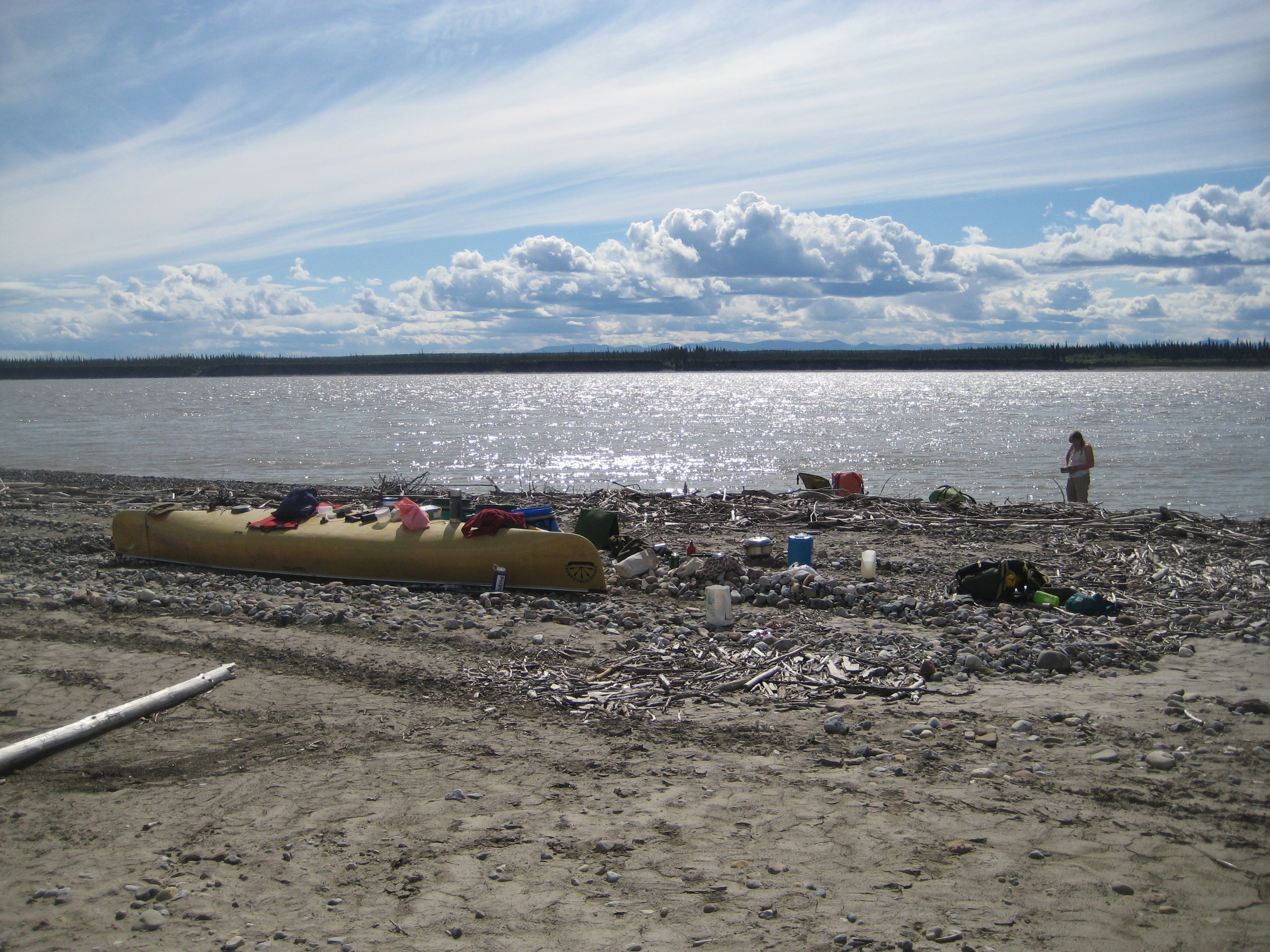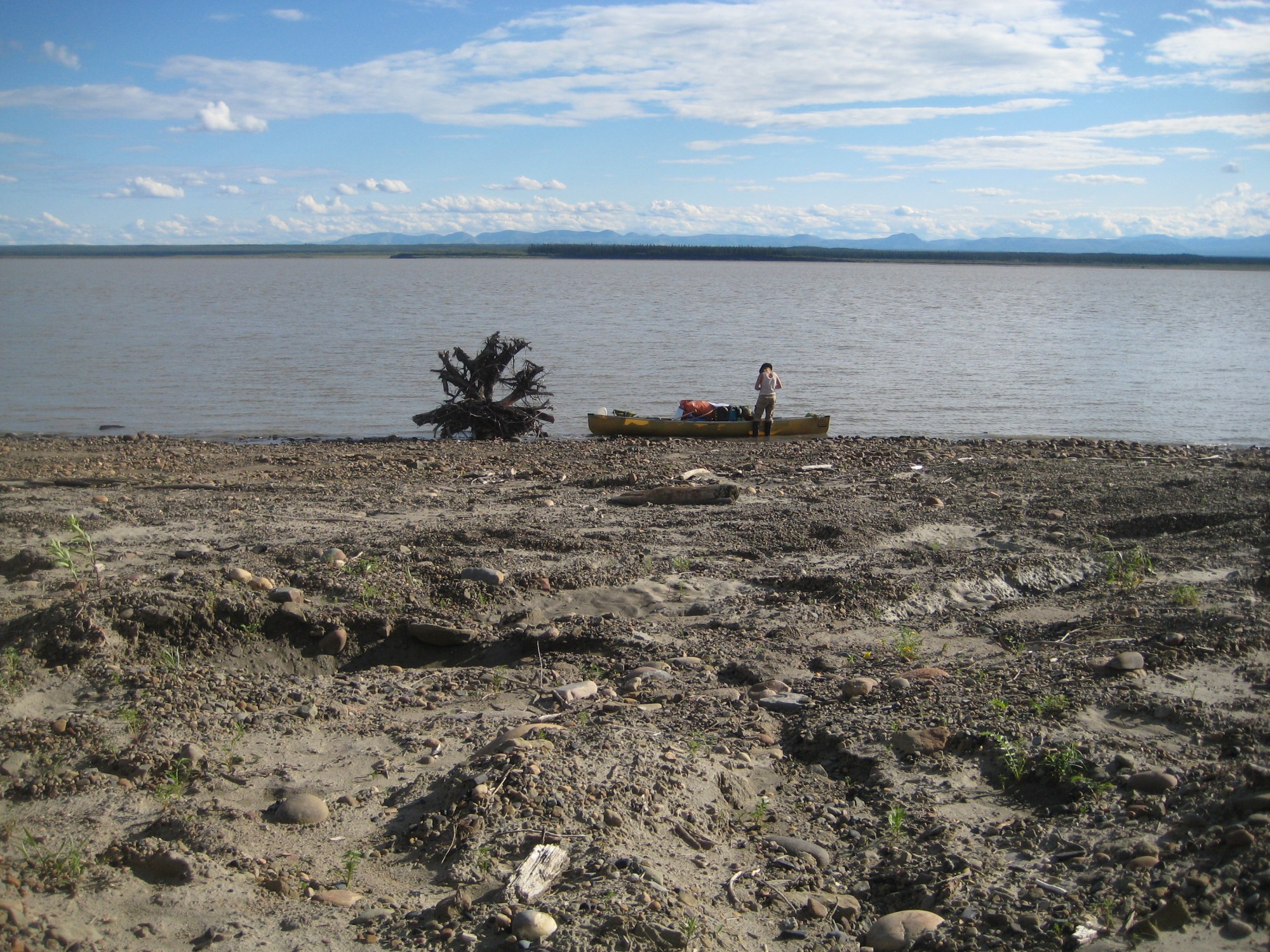 made it to norman wells after sleeping in til 1:30 pm. hoo boy. and passed the 1000km mark! woot! it’s a big town, comparatively to wrigley, tulita and fort liard, but it even seemed bigger than fort simpson to me, though the internet tells me i am wrong about that. i guess we only walked the main strip in fort simpson. camped on the beach at the bottom of the waterfront cliffs and went up for restaurant dinner and wifi. it’s a very different feel here than some of the more traditional communities we passed through, there’s more foreigners here. i found i preferred the feeling in the other communities. the human-made islands here are also weird, extracting oil from mid-river. we didn’t know about them before arriving so were a little confused to see from afar these things in the river that weren’t on our maps. the river water felt less safe to me pollutant-wise after norman wells. also, interestingly, for the next few days emma and i referred less to it as the deh cho and more as the mackenzie. perhaps a combination of being in norman wells and the perceived pollution entering it, it changed in my head and became a slightly different river.