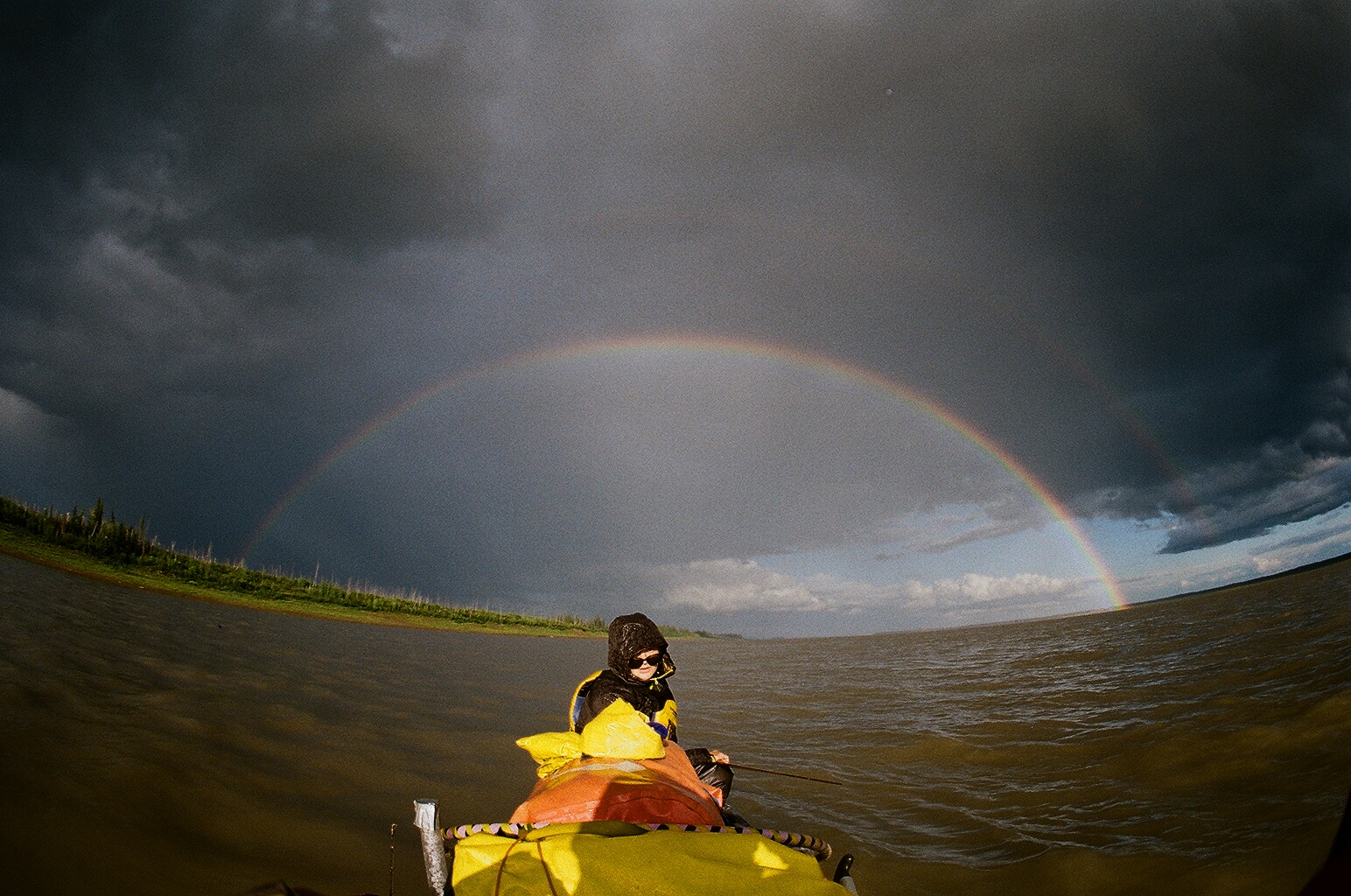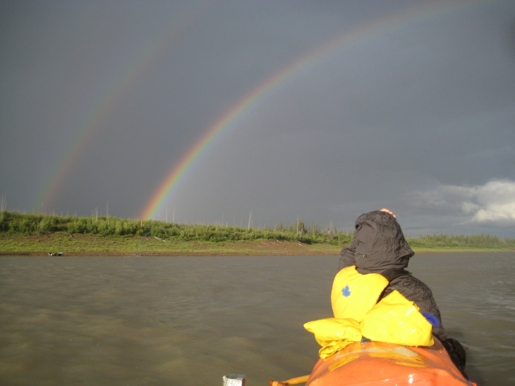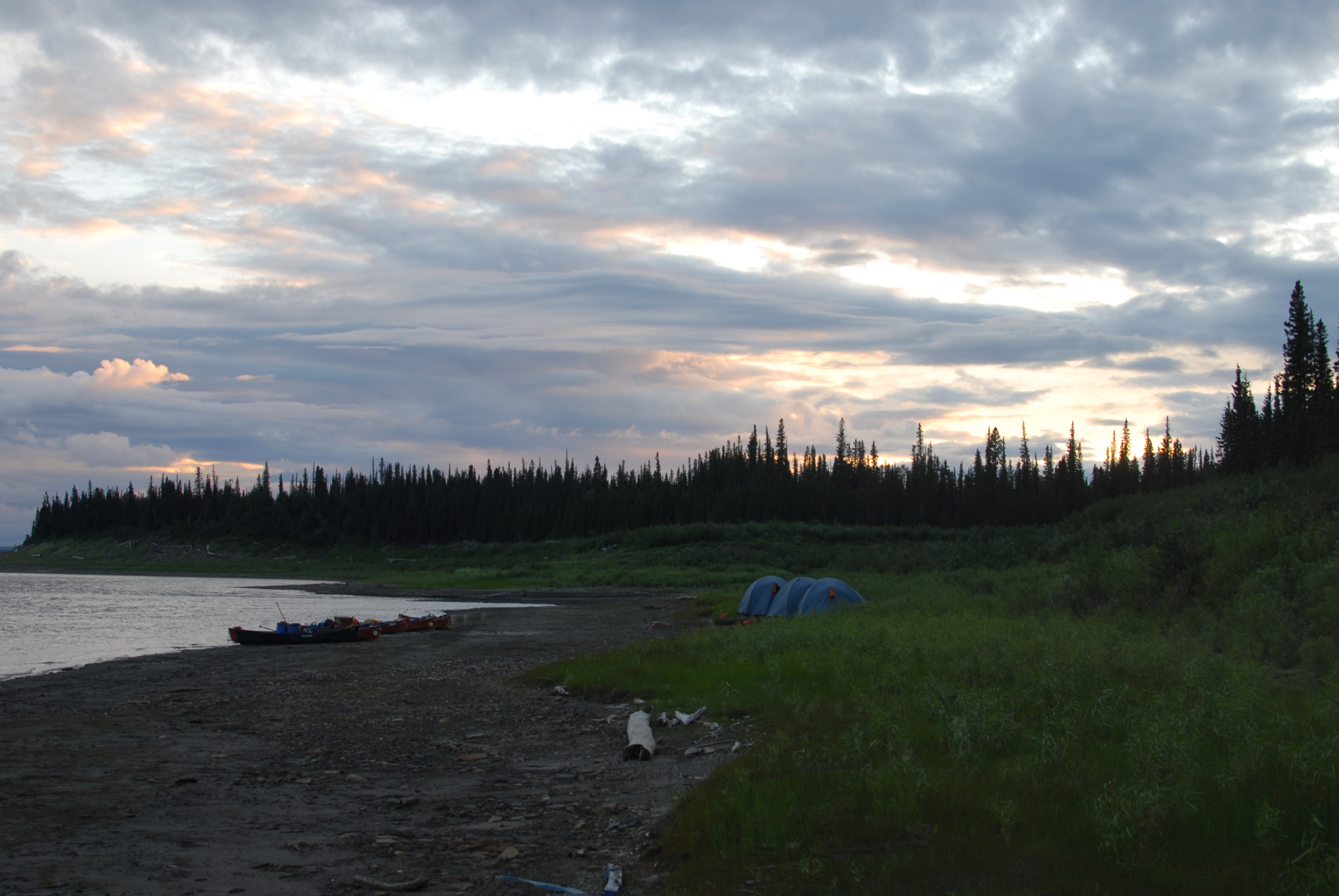 after a whole day of calm we had a headwind on departure, sigh. a rain-shower rolled in bringing with it a double rainbow that at points seemed to touch down in the water right beside us. we managed to get about 2okm before heading for the lee of a point where billy creek enters the deh cho. getting closer to it emma picked out the sac dene tents! yeah! we thought they might be long gone since we hadn’t seen them in norman wells. pulling up nat and ben came to greet us, but everyone else was sleeping. they said they were going to try to head out at 2am if the wind calms, and hadn’t been able to make good time so far due to it. well, it was 1am by the time we went to sleep – the wind was calmer, but still there.