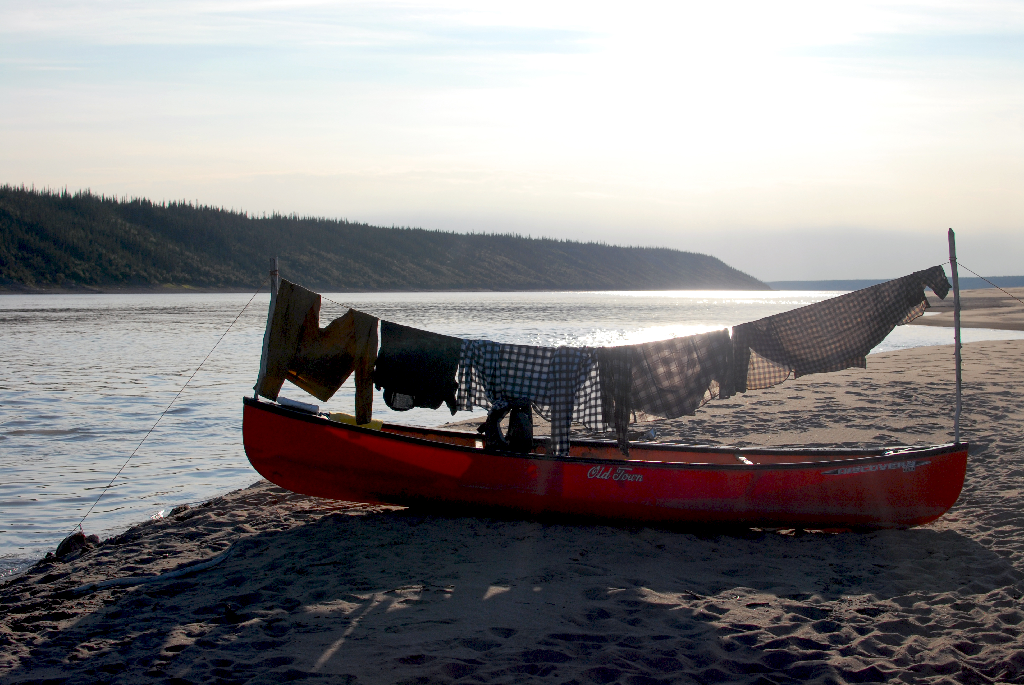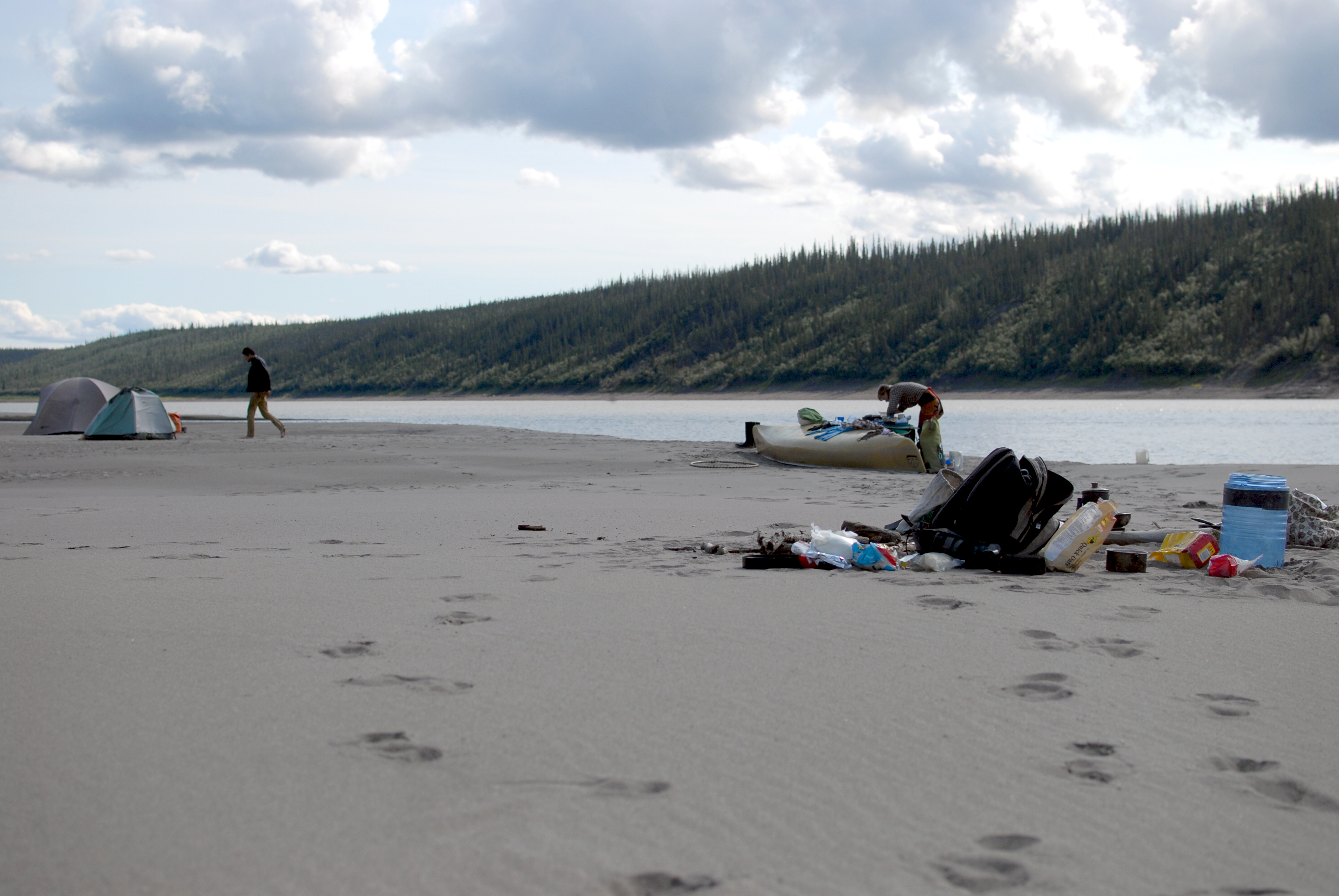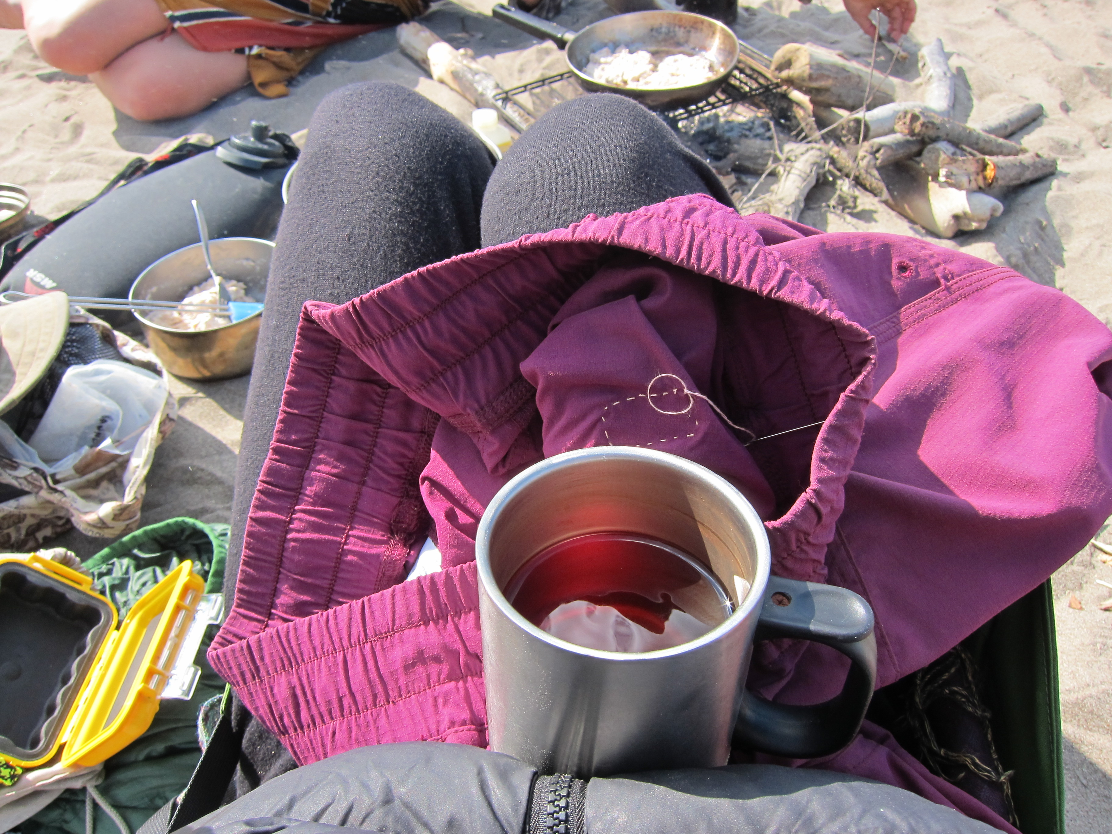 decided to stay for a rest day and enjoy the calm weather. around +23, i’d guess. water came up overnight, an inch or two, first time we’ve noticed it do that. swam and bathed and laundered. charged batteries (solar panel works! it was on the fritz one day, but it must have been the heat). had emma’s deelish bacon potato pancakes with bannock. will went “shopping” on the mainland for firewood and came back to make bread in a sand and stone oven he built. had felafel, rice and green beans for dinner. wrote postcards. drank tea. sewed things. had a bonfire at night. so nice to just be here and not be moving through like usual.
