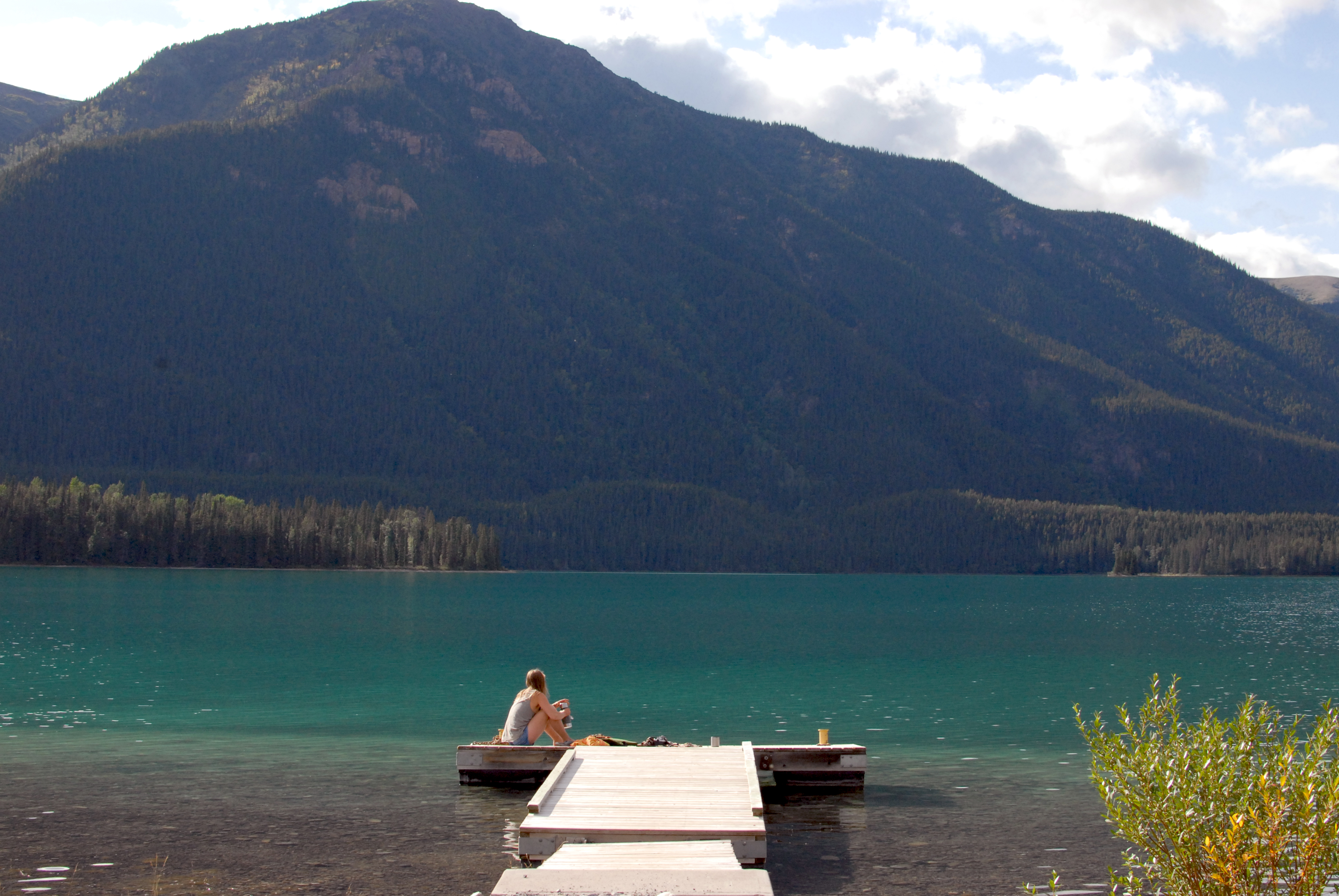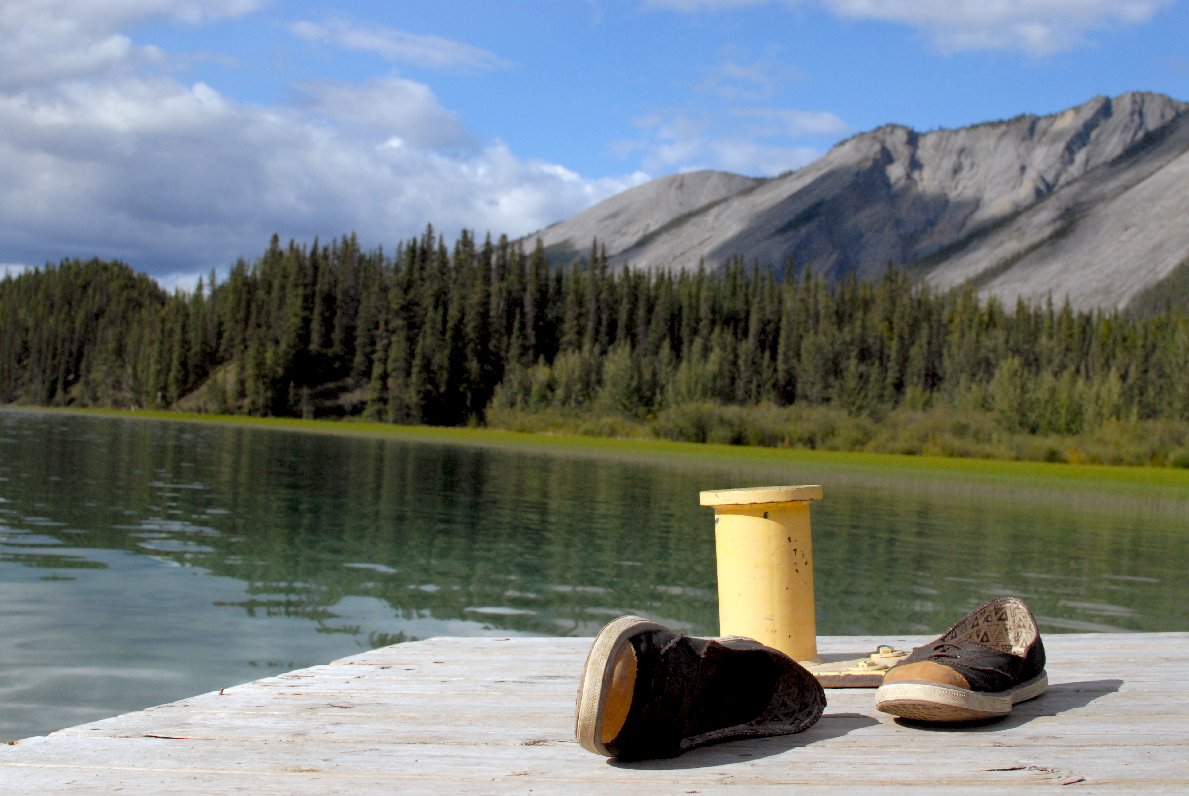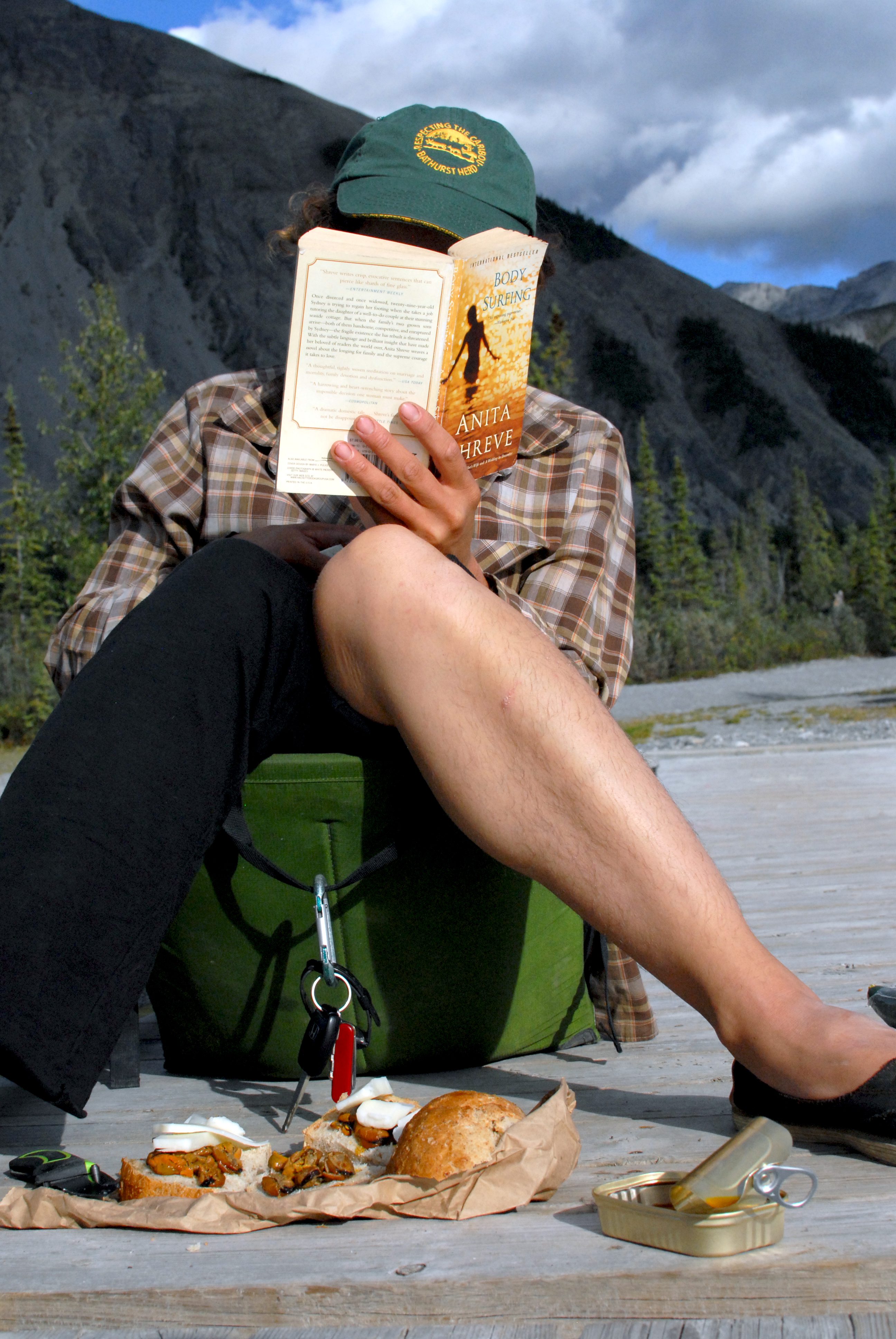 we had camped across the highway from the hotsprings last night because the hotsprings campground was full. this morning when we pulled in we parked beside a truck with a canoe on top of it. as we were setting up the stove to make breakfast, the man who owned the truck came back from the springs and we asked him about whether he was headed out on a canoe trip. he was from alberta, worked in oil, and was on a week holiday. he was going on a big circle roadtrip and his friend suggested he bring his canoe to drop in lakes along the way. we told him where we’d been and he said, hey, my friend jason was canoeing the mackenzie this summer! ha ha! the small-world things amazes me quite a lot. we learned about caitlin and jason from the visitor logs in the info centers we stopped at along the river. we first saw their names in the fort simpson log, then again in the norman wells log. despite hearing about them the whole way along, and the fact that they went on to tuk and we didn’t and could’ve ended up meeting them back in inuvik at the impromptu reunion, we never did. we did get to hear about them and see a couple of photos though because mike and cole had paddled with them for a bit.