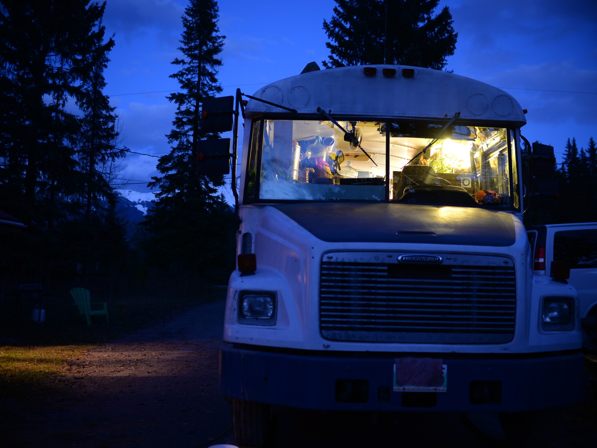 the mountains were dreamy, a shroud of fog in the early morning light. snow up on the peaks, but roads clear ahead. a calm cat getting used to the journey. passing through one zone into the next, the soft aridity in sicamous, salmon arm, chase. then driving into kamloops. oh kamloops, i did not expect this from you. we made it over the kicking horse and rogers pass just fine, but kamloops, it whooped our ass. shortly before reaching the top of the summit into kamloops i noticed the water thermostat heading into hot zone. i was explicitly told by jim – the bus mechanic who came by to take a look at my cruise control before i left – that i should not let my water temperature get over 207 degrees. apparently these buses like to hover between 200-207 as their normal operating temperature, but trouble starts if you let it go even one degree higher. so i pulled off the highway into a canadian tire parking lot. i let the bus idle for a bit with the fan on (one of my mistakes, i forgot to turn the fan on til the end b/c the previous hills had been a breeze) and opened up the hood to make sure the fan was working. fan looked good, coolant looked good. i went to take a pee and on my way back a man with a ball cap and bushy grey beard asked me about my bus. i told him all was good except it was getting into the dangerous range for water temperature. well he asked to look at my engine and i said sure. he checked out the fan belt and then looked at my radiator and said oh, you need to clean your radiator. i took a look and sure enough it was filthy. who’da thunk – a dirty radiator. perhaps this is obvious to many of you out there, but it just never occurred to me to clean the radiator – to make the connection of stuffed up cooling fins equals no air circulation equals no help to the poor coolant trying to do a good job keeping the engine happy. oops. i have been too used to newer cleaner vehicles in these last years. i am INCREDIBLY indebted to the kind kamloops man with the bushy grey beard and little red mazda truck for being there at that moment and taking the time to help me out. after bestowing his kindness upon me he directed me to the rv wash on the other side of the highway.