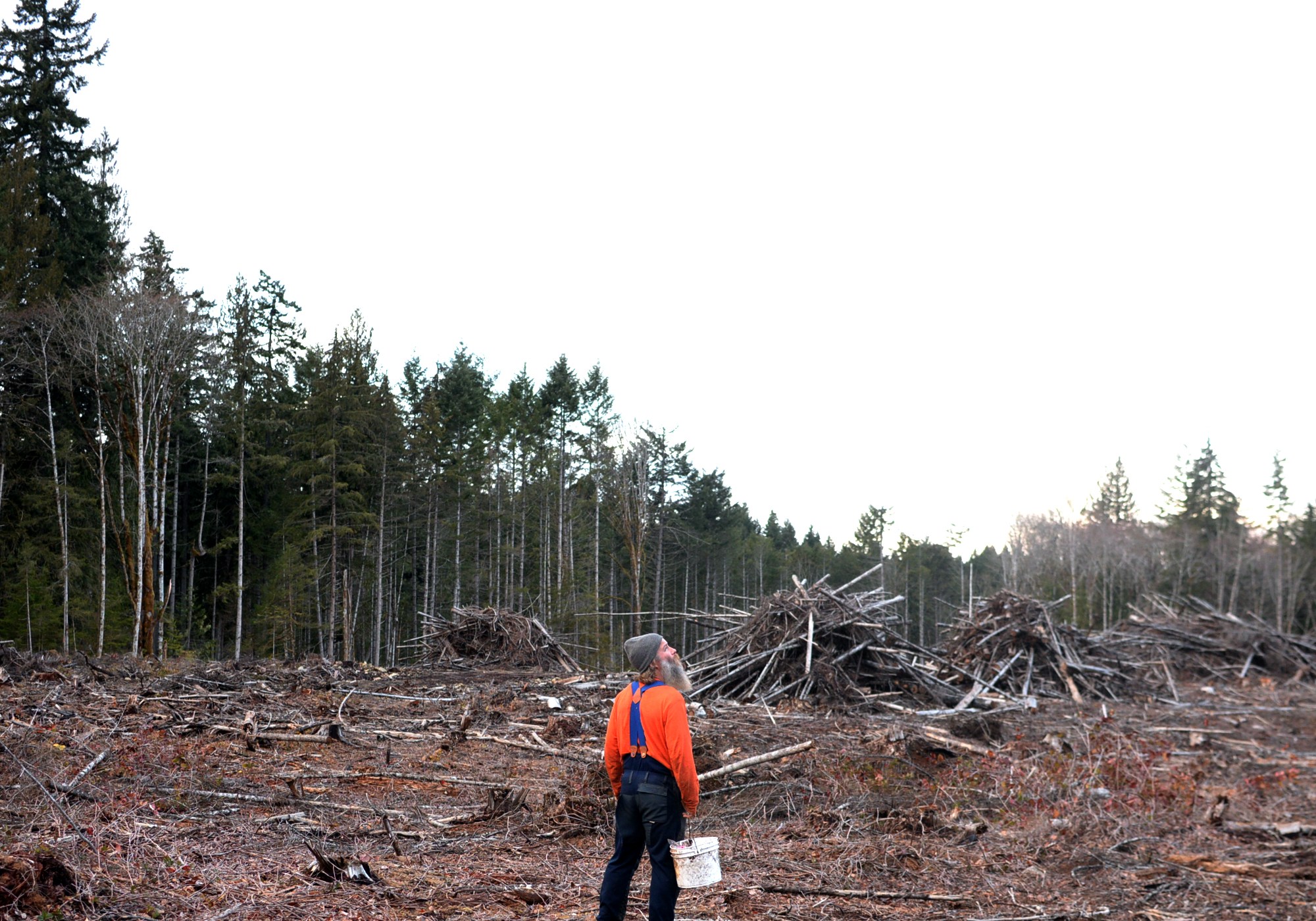 the next day dharma and i go in search of the clear cut i can see across the river. we head up the steep bank and he knows of an old skid road somewhere in the bushy undergrowth. when the road is found, a grove of maple, alder and douglas fir is also, a natural amphitheatre of beauty, a small still pond with a mossy bottom, the perfect spot for a cabin in the woods. the skid road brings us to the logging road in the midst of clear-cut. we continue on the road and break off at a hill, up the hill there are fresh elk tracks, and on the other side, oh…. a ridge-line brings a view, stupendous, breathtaking. standing in the treeless land the thoughts come when you are there beholding. there is both wonder and sadness, but also a whole mix of so much in between. they have logged to within 5 meters of the river bank. thank you stephen harper for your foresight and thought of future generations. dusk is approaching as we turn south towards home and stumble upon beauty after beauty. a cliff-side moss carpet overlooking the river – a perfect spot to camp and watch the stars. then in a valley, a dark soft wet grove of enormous moss-laden old-growth fir and cedar. we wade the river in the encroaching darkness – my pants get wet in the icy thigh-high water (i thought it was only shin deep) – and finally find the way back to the trail as the moon begins to light the way.
