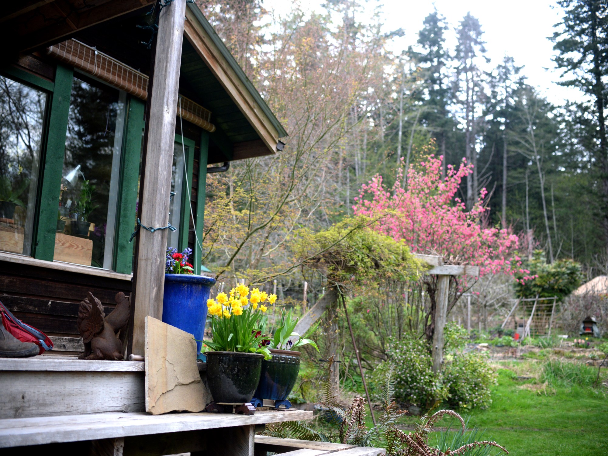 so saltspring. oh saltspring. how is it i have never been to this island before? maybe because the wee island is so firmly entrenched in my heart, i had no room for other islands? who’s to say? i have been on the spring busy train, i think, wanting to get out, explore, do new things, visit with friends, replenish, revel. the long weekend seemed like a good opportunity to visit a long-time old friend and experience a new place to boot. it was immediate joy biking off the ferry – the trees, the spring buds, the beautyfull funky houses, the feeling of island (i realize van isle is also an island, but because it’s so big, that feeling is quite diluted), the riding of my bike down new unknown roads. i was probably grinning like a fool. coreen and ken were so welcoming and generous with their space and time. i stayed in their incredibly inspiring wee guest cabin, built above a small workshop/storage space, a lovely little building. and it made me want to start working on my own! oh the impatience! i arrived at their house shortly after dark and we continued my current trend of after midnight bedtimes, oh boy. the next day was SUNNY (eeeeeee!), so after a relaxing morning of coreen’s delicious buckwheat pancakes, and a tour of ken’s fabulous inspiring workshop, i took to the road to see ganges. like i said, i am used to the wee island, where there are almost no amenities, so it felt strange to be on a gulf island and have a ‘town’ with real chain grocery stores, retail stores, hardware stores, galleries, restaurants, pubs, schools, etc. an economy essentially. it kind of made me question why i am choosing to move to an island with none of those things, and a ferry i easily get sick on during rough weather. though maybe the answer is partly in the question – remoteness, a more basic lifestyle where if you want something, it is more likely you’d get it faster if you made it yourself. there are many reasons, though i must say i am a bit hazy on them right now just because i had such a good visit. i went to a great little show at a gallery in the square, all works done by one woman who did a lot of layering with duralar (like vellum), which was right up my alley. inspiring. after checking out the shops and sitting on the beach with a snack, i made it home in time for all of us to head out to coreen and kens friends for dinner. the inspiration did not stop coming. i had not previously met s & c, but they welcomed me warmly. s took us on a tour of their incredible garden and told us about all the work and redesigning they are doing out there, and inside c made us a sumptuous mouth-watering dinner of pad-thai. o h m y g o s h. it was divine. and it had egg AND chicken AND shrimp in it. s said a dozen eggs went in:) a little lazy while after dinner we sauna-ed in their lovely huge sauna. i gotta say, i am going for a record in saunas these days, i having them A LOT. maybe about once a week. and i think i am just going to keep going. such thought-provoking subjects came up at dinner. s & c had just come back from sri lanka where they learned the concept of light and dark money from a local. they were told by this man that sri lankans generally did not accept dark money because dark breeds dark and light breeds light. they have no desire for darkness in their lives. so if a waiter is being lovely to you, it is not because s/he wants tips, it is because s/he genuinely wants you to be enjoying yourself. light brings light. another local asked c what his spiritual practice was, and he had to think about it and realized it is gratitude. which jostled me and made me realize it is mine too. i consider myself spiritual, but it is an unnameable spirituality, just that i believe in something greater, a sort of cause or reason for it all, maybe. but gratitude feels right, a constant giving thanks for all that we have, all that we are given, all we have the fortune of beholding.