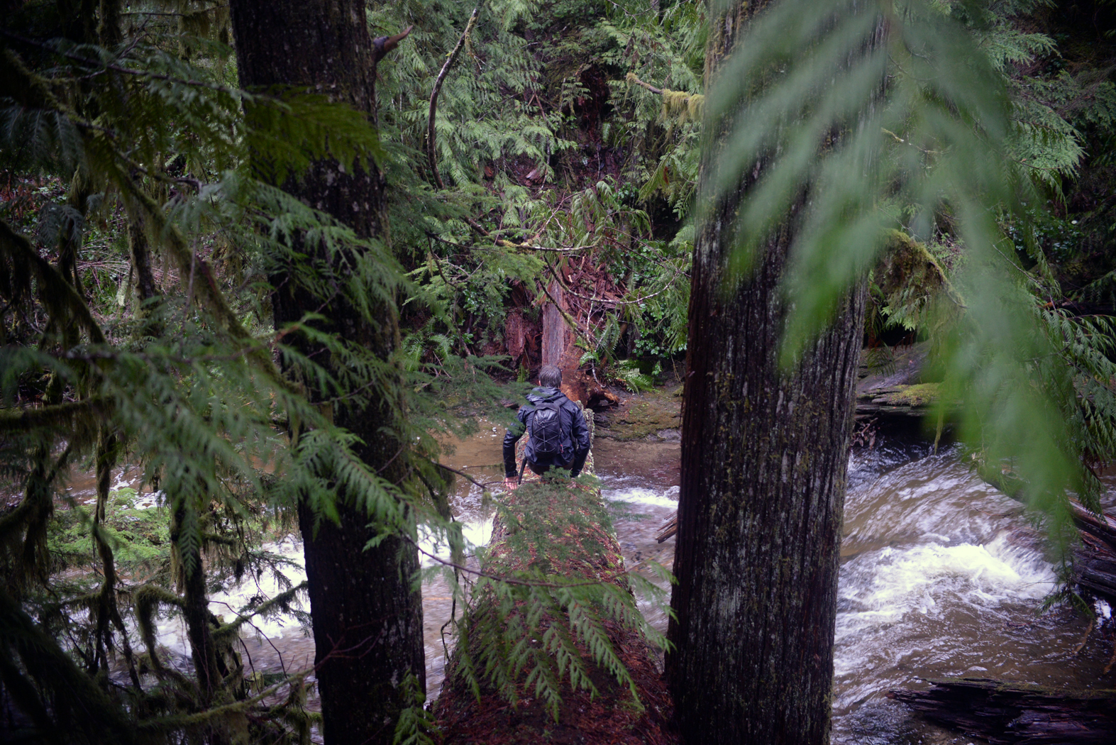 we went wandering. we went wandering on what happened to be a day of so much wind and precipitation that 70,000 people on the island and in vancouver lost their hydro power, and the mt.washington ski hill closed for the day because there was too much snow (this makes me laugh so hard). my best guess was that it would be about a 5 hour hike, which is what i told ben. we were going to cross the river at the footbridge and find our way through a rough trail to a clear cut and then the logging road network, then walk along the main until it crossed the creek emma and i found last summer. the goal was to follow the creek downstream all the way to its confluence with the river, then walk back along more logging roads with bits of bush-crashing interspersed when necessary. i printed out some satellite pics from google maps, as those are the best maps one can get of the ever changing logging road/clearcut terrain. we started out from the car around 12:45, which, when i think about it now, realize would not have us back to the car by dark. or it would, barely, just without a margin for error. but i wasn’t thinking that at the time. i left nanaimo the earliest i could, so we worked with what we had. and 5 hours was only an estimate, when i guess times for things, i usually add time on to what i really think the time is, so there is built-in slack. so really, i thought we would be fine (ha ha ha). on the main, we passed over two creeks right before we took the bigger one that i suspected was the correct one. it w a s fairly wet out, so we didn’t stop for too long any one place, keeping up a reasonably steady pace. i know in the past i have gone on and on about how i love it in the woods, so i won’t continue going on and on here. just let me say, it was gorgeous in there. despite the rain and grey and wind, of course i loved it. in the summer the creek was so tame and low that it was wadeable. this day however, it was rushing. even if i could have made it across depth-wise with gumboots on, i wouldn’t have trusted myself in its speed. on the way down, we crossed about 7 smaller creeks flowing into the main creek, one of which had a stunning little waterfall! i wondered to myself how many human eyes had ever seen it. eventually it started to get dark but i still wasn’t recognizing anything. walking the creek in the opposite direction than i had come before, i assumed i would at some point recognize the previously travelled territory. but when we checked the time, it was 1/2 an hour to sunset, somewhere in unknown woods along a creek, and pouring. we decided to cut overland back in the direction of the bridge, knowing we’d hit a logging road eventually, and hoping we’d end up following it in the right direction. so we stopped to pull out snacks, the compass ben thankfully borrowed from a friend (i’d left mine on the wee island) and his headlamp. he also asked me to pull out the extra batteries from the bottom of a stuff sack, because his hands were numb from the cold. i asked how many batteries, two, three? and he said eight. i had a moment of – whaaaaaaaat!? this is a ridiculously un-economical headlamp! until he clarified that he’d just bought eight, but we only needed three. i couldn’t stop laughing over this. i think the approaching darkness was making me mildly hysterical.